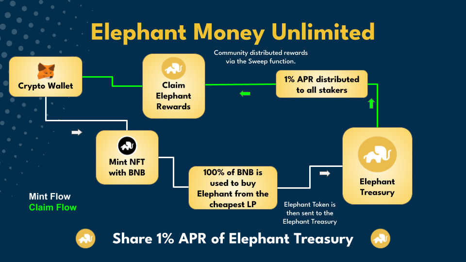 When a user mints an NFT using BNB, **100%** of the BNB is used to purchase Elephant Token from the cheapest liquidity pair (ELE/BUSD or ELE/WBNB) at that time.&#x20;
